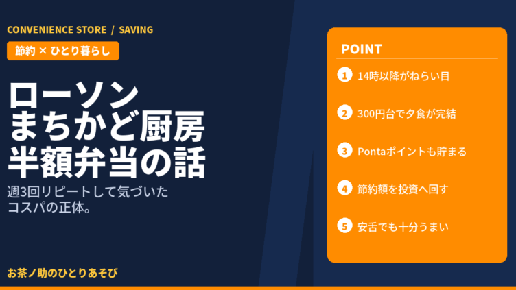 ローソンまちかど厨房の半額弁当を週3回リピートしています。ねらい目の時間帯・お茶ノ助的ベスト3・節約額を投資に回す試算まで。ひとり暮らしの節約飯として正直にレビューします。
