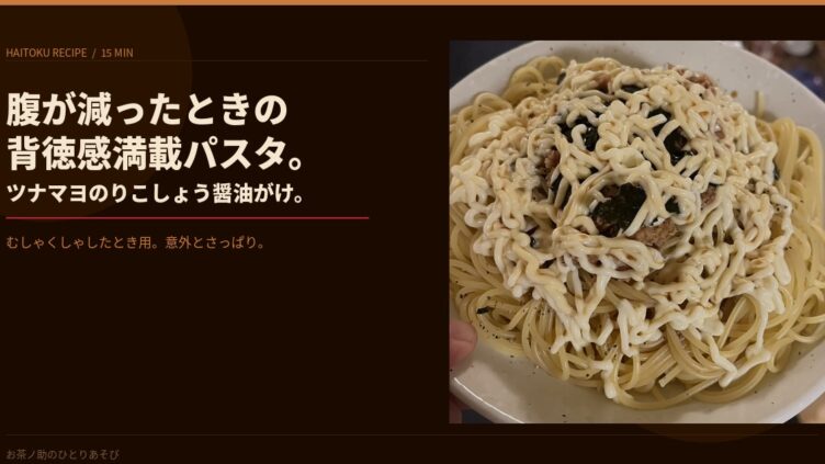腹が減りすぎたとき、むしゃくしゃしたとき用の節約パスタです。ツナ缶・マヨ・のり・こしょう・醤油をぶっかけて混ぜるだけ。15分で出来て意外とさっぱり。ひとり暮らしの背徳レシピ。