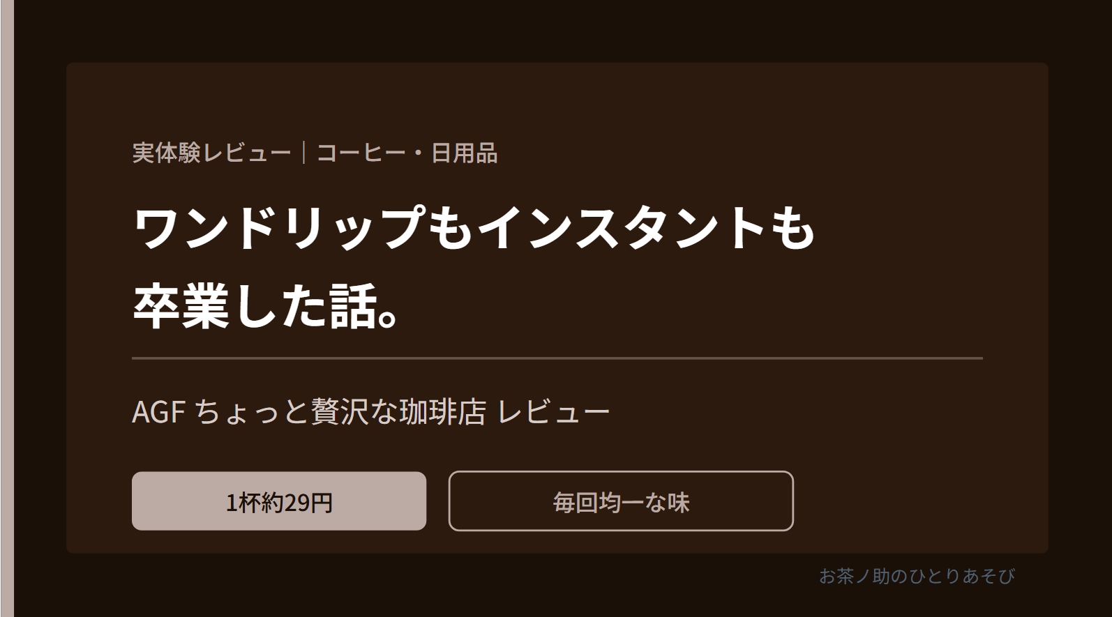 ワンドリップの手間とインスタントの味ムラという2つの悩みを、このスティックコーヒー1本で解決できました。1杯30円以下で均一においしいコーヒーが飲めるのはシンプルに最高です。