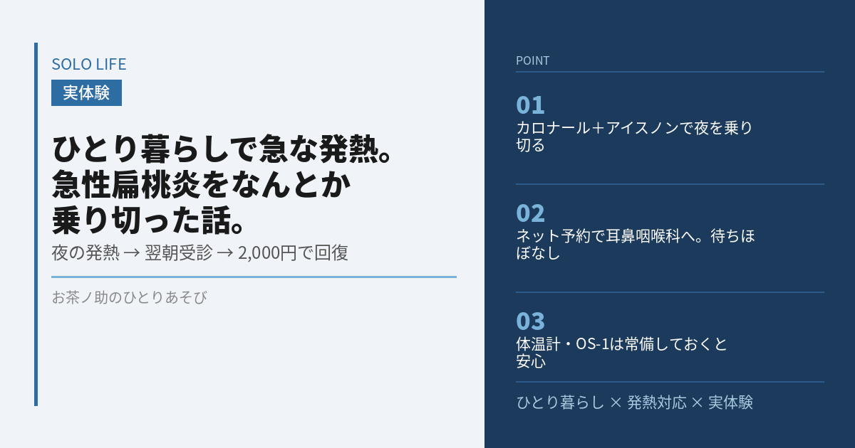 ひとり暮らしの発熱は、地味につらい。助けを呼べる人もいないし、自分でなんとかするしかない。今回の経験を、同じ状況で困っている人の参考になればと思って書きます。