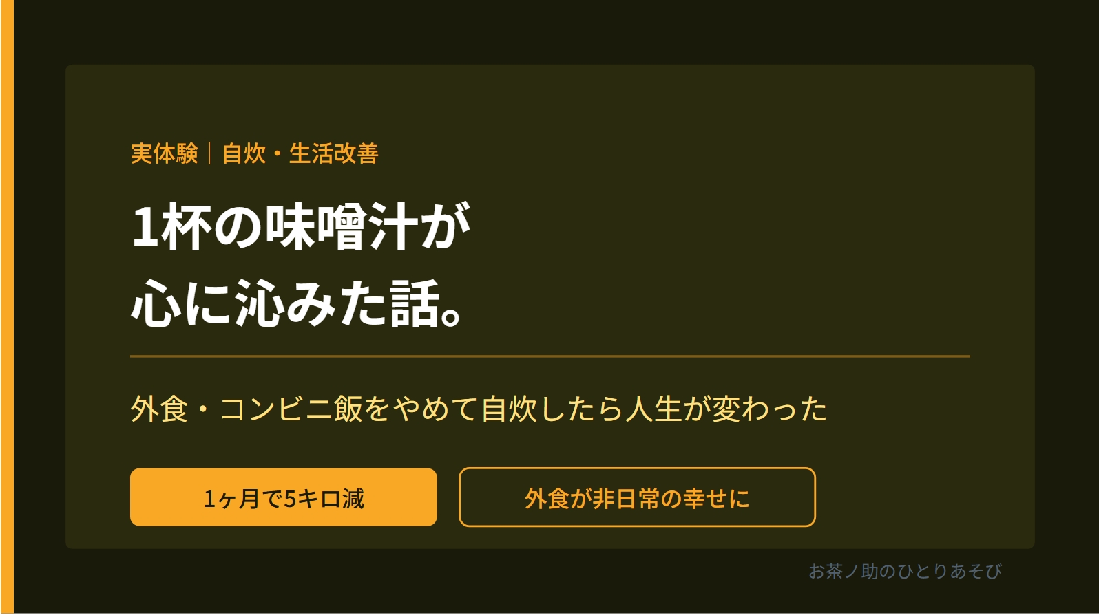 外食とコンビニ飯ばかりの生活から、自炊に切り替えたら人生が変わりました。どうも、お茶ノ助です。1杯の味噌汁の話をします。