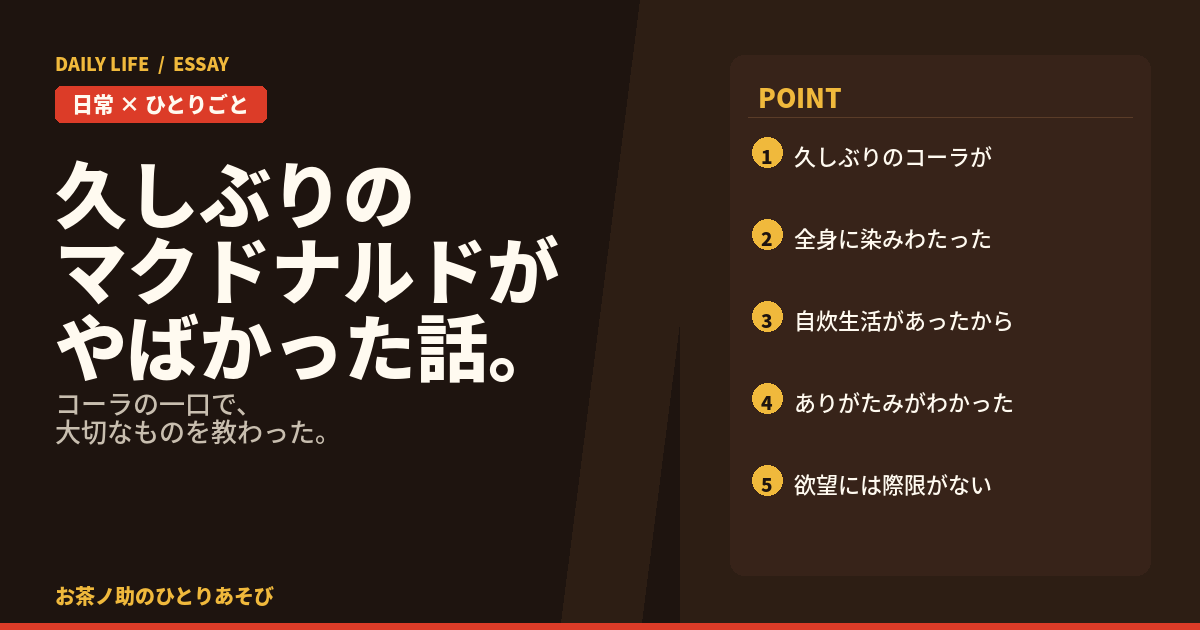 てりたまも、ナゲットも、マックポークも、全部おいしかった。でも一番記憶に残っているのはコーラの最初の一口です。